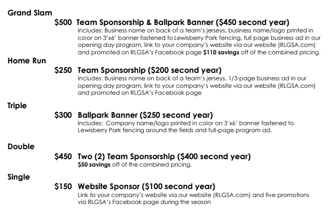If Interested in becoming a sponsor or have additional questionsPlease email Jeanette Reed at [email protected]RLGSA SPONSORSHIP OPTIONSAs Always, We Appreciate Your Support!